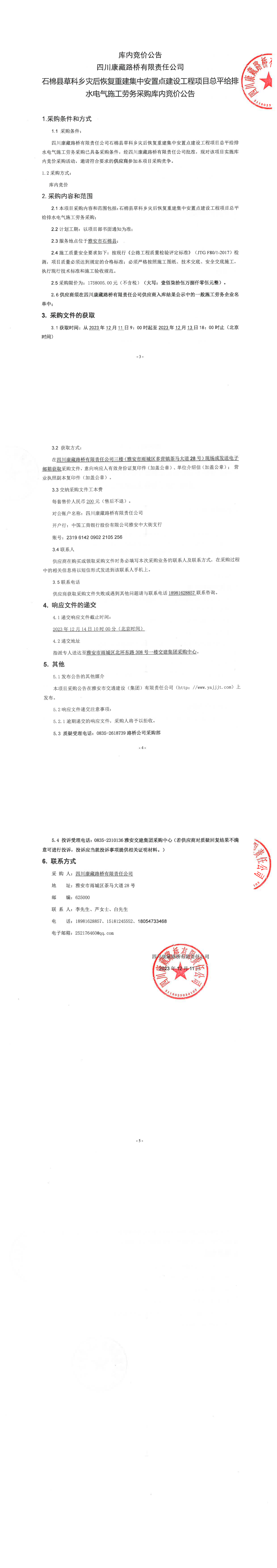 四川康藏路橋有限責任公司石棉縣草科鄉(xiāng)災后恢復重建集中安置點建設工程項目總平給排水電氣施工勞務采購庫內競價公告