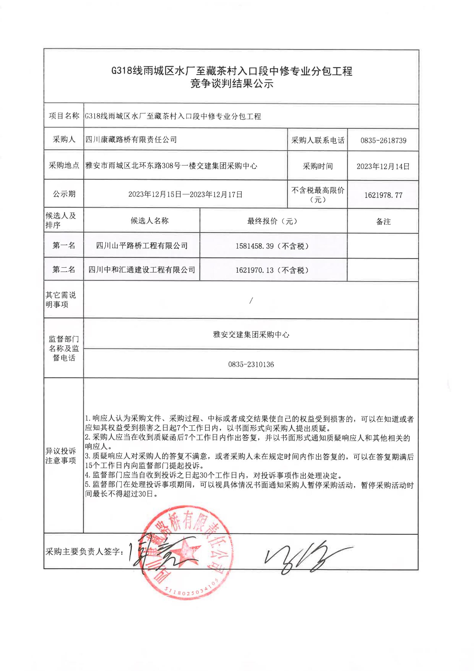 四川康藏路橋有限責(zé)任公司G318線雨城區(qū)水廠至藏茶村入口段中修專業(yè)分包工程競(jìng)爭(zhēng)談判結(jié)果公示
