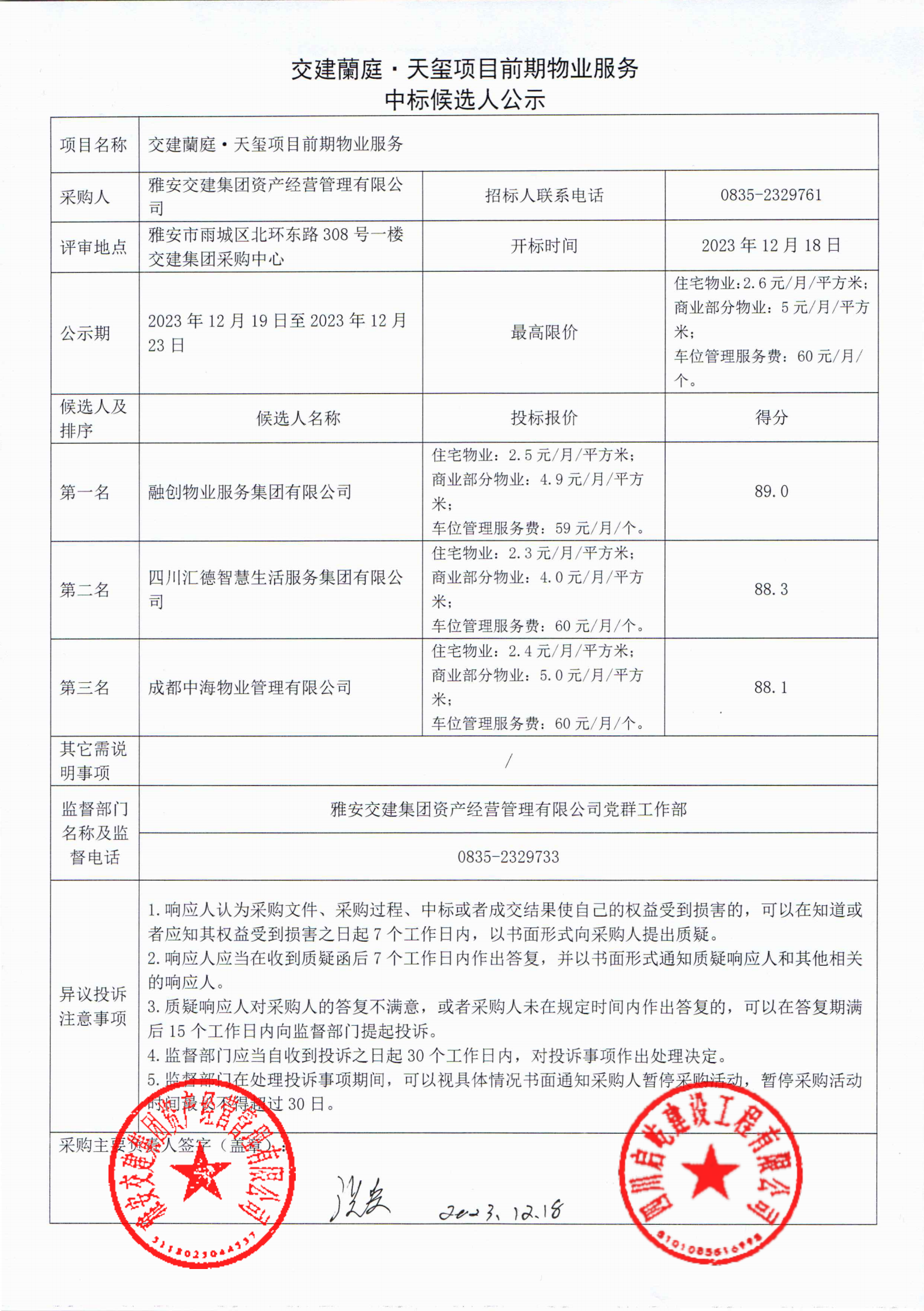 雅安交建集團資產(chǎn)經(jīng)營管理有限公司交建蘭庭·天璽項目前期物業(yè)服務(wù)中標候選人公示
