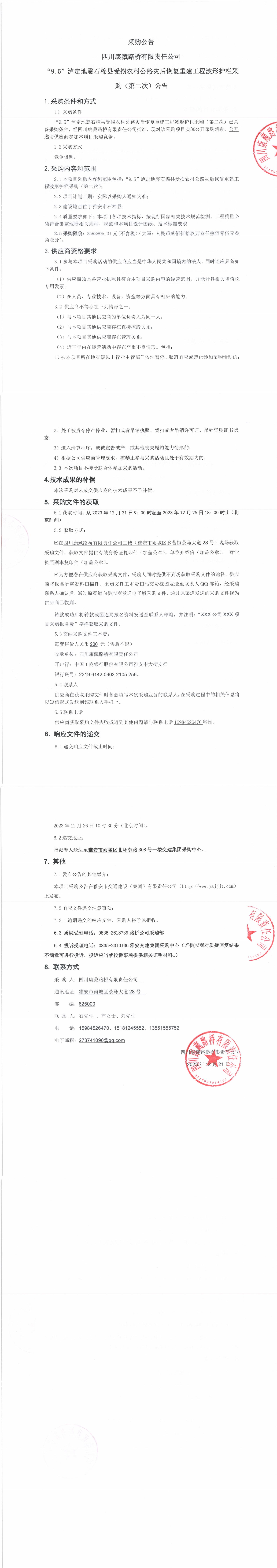 四川康藏路橋有限責任公司“9.5”瀘定地震石棉縣受損農(nóng)村公路災后恢復重建工程波形護欄采購(第二次)公告