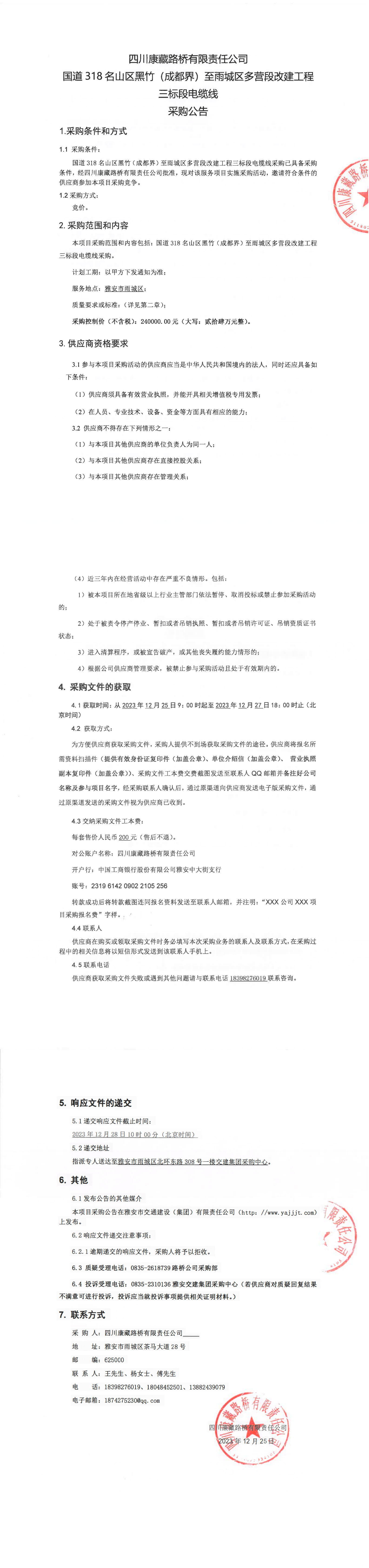 四川康藏路橋有限責任公司國道318名山區(qū)黑竹(成都界)至雨城區(qū)多營段改建工程三標段電纜線采購公告
