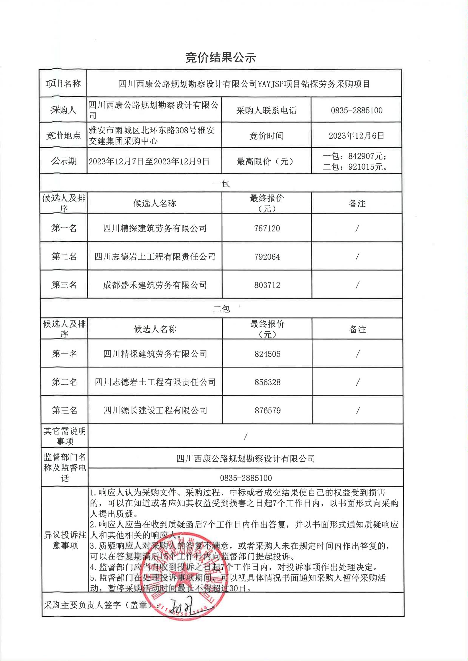 四川西康公路規(guī)劃勘察設計公司YAYJSP項目鉆探勞務采購項目競價結果公示