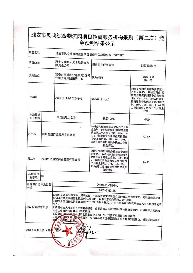 雅安交建集團(tuán)無水港物流有限責(zé)任公司雅安市鳳鳴綜合物流園項(xiàng)目招商服務(wù)機(jī)構(gòu)采購(gòu)(第二次)競(jìng)爭(zhēng)談判結(jié)果公示