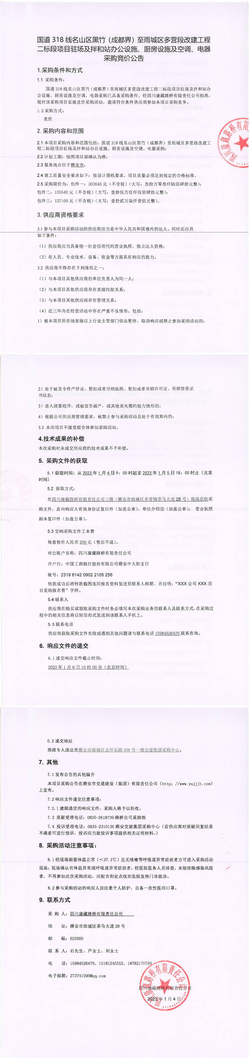 四川康藏路橋有限責(zé)任公司國道318線名山區(qū)黑竹(成都界)至雨城區(qū)多營段改建工程二標(biāo)段項目駐場及拌和站辦公設(shè)施、廚房設(shè)施及空調(diào)、電器采購競價公告