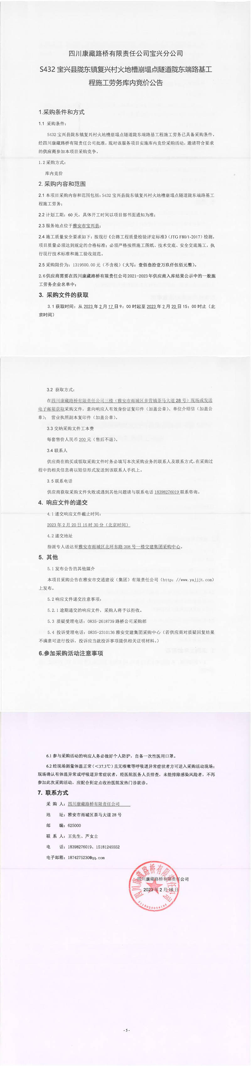四川康藏路橋有限責(zé)任公司S432寶興縣隴東鎮(zhèn)復(fù)興村火地槽崩塌點(diǎn)隧道隴東端路基工程施工勞務(wù)庫內(nèi)競價(jià)公告