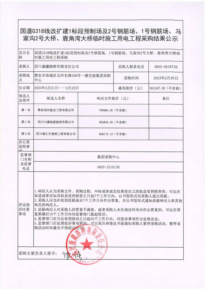 四川康藏路橋有限責(zé)任公司國道318線改擴建1標(biāo)段預(yù)制場及2號鋼筋場、1號鋼筋場、馬家溝2號大橋、鹿角灣大橋臨時施工用電工程采購結(jié)果公示