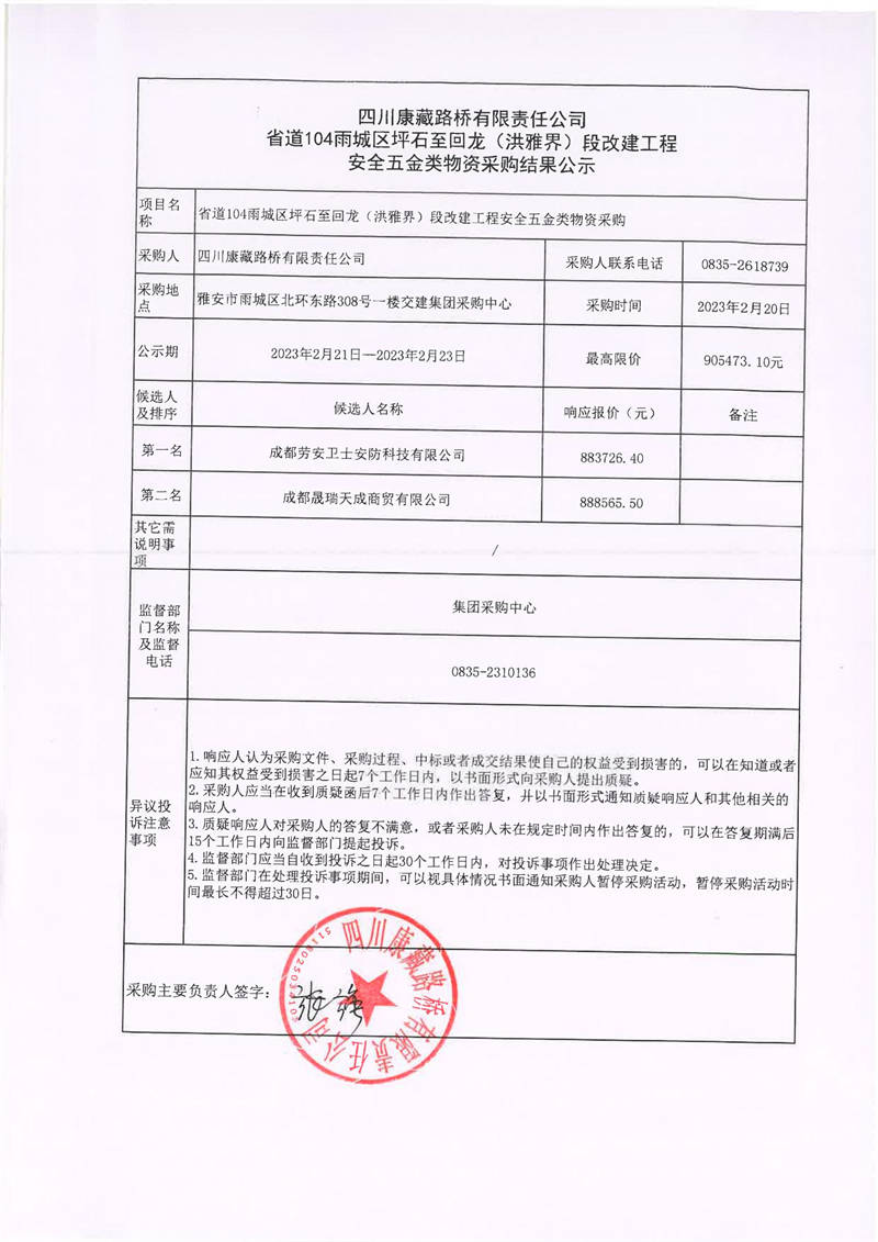 四川康藏路橋有限責任公司省道104雨城區(qū)坪石至回龍(洪雅界)段改建工程安全五金類物資采購結(jié)果公示