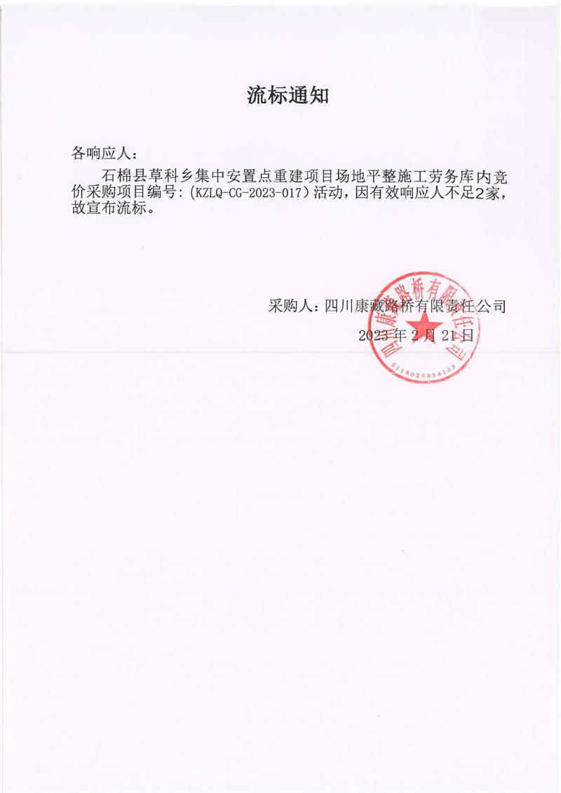 四川康藏路橋有限責(zé)任公司石棉草科鄉(xiāng)集中安置點(diǎn)重建項(xiàng)目場(chǎng)地平整施工勞務(wù)庫內(nèi)競(jìng)價(jià)流標(biāo)通知
