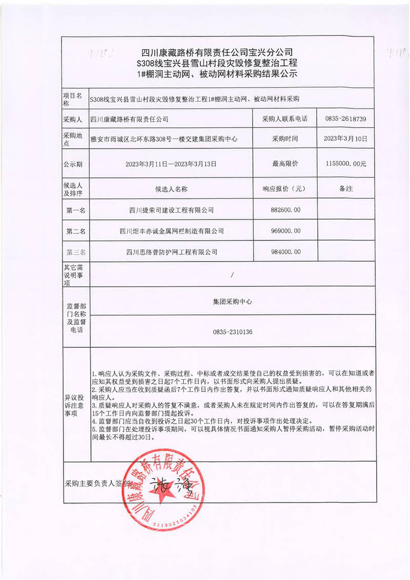 四川康藏路橋有限責(zé)任公司寶興分公司S308線寶興縣雪山村段災(zāi)毀修復(fù)整治工程1#棚洞主動網(wǎng)、被動網(wǎng)材料采購結(jié)果公示
