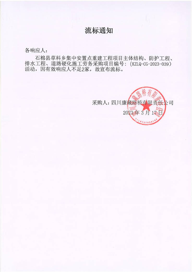 四川康藏路橋有限責(zé)任公司石棉草科鄉(xiāng)集中安置點重建工程項目主體結(jié)構(gòu)、防護工程、排水工程、道路硬化施工勞務(wù)采購流標通知