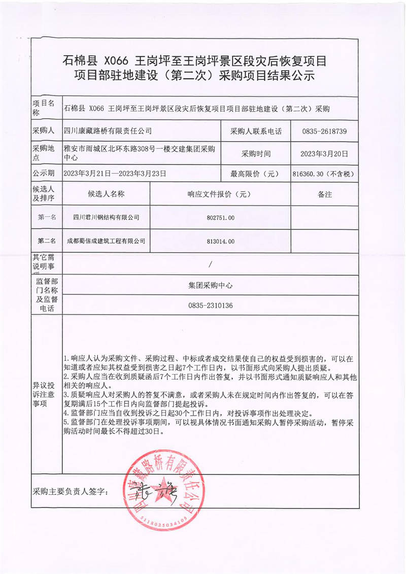 四川康藏路橋有限責任公司石棉縣X066王崗坪至王崗坪景區(qū)段災后恢項目項目駐地建設(第二次)采購結果公示