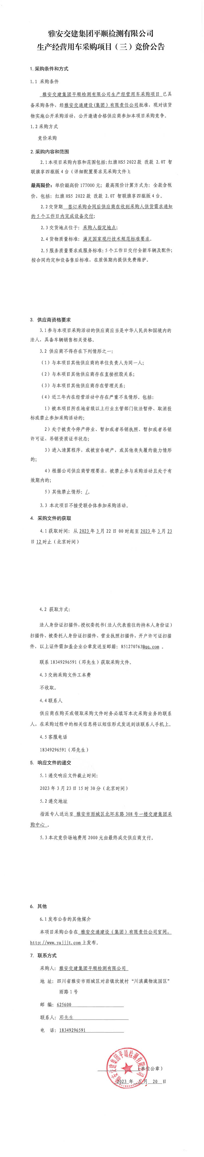 雅安交建集團(tuán)平順檢測有限公司平順公司生產(chǎn)經(jīng)營用車采購項(xiàng)目(三)競價(jià)公告