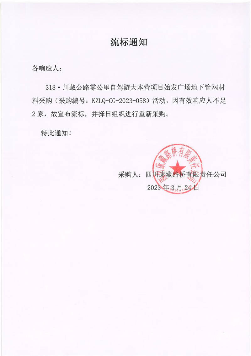 四川康藏路橋有限責(zé)任公司318·川藏公路零公里自駕游大本營項目始發(fā)廣場地下管網(wǎng)材料采購流標通知