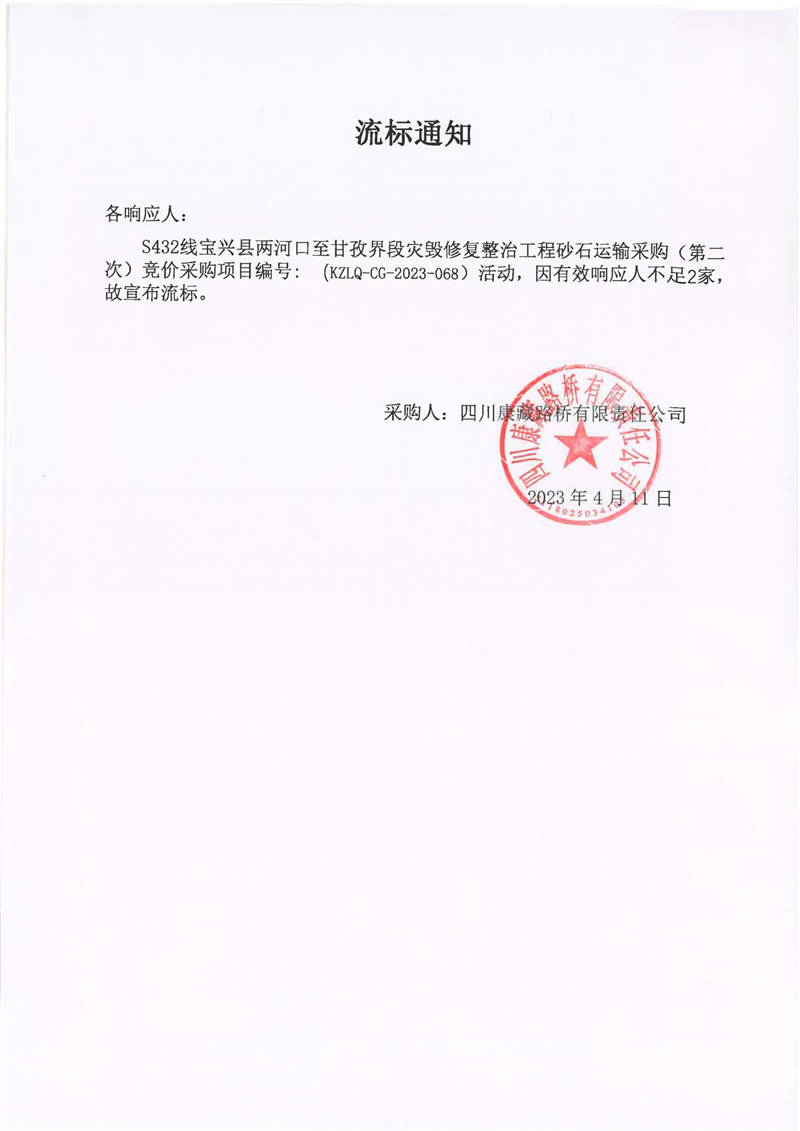 四川康藏路橋有限責任公司寶興分公司S432寶興縣兩河口至甘孜界段災(zāi)毀修復(fù)整治工程砂石運輸采購(第二次)流標通知