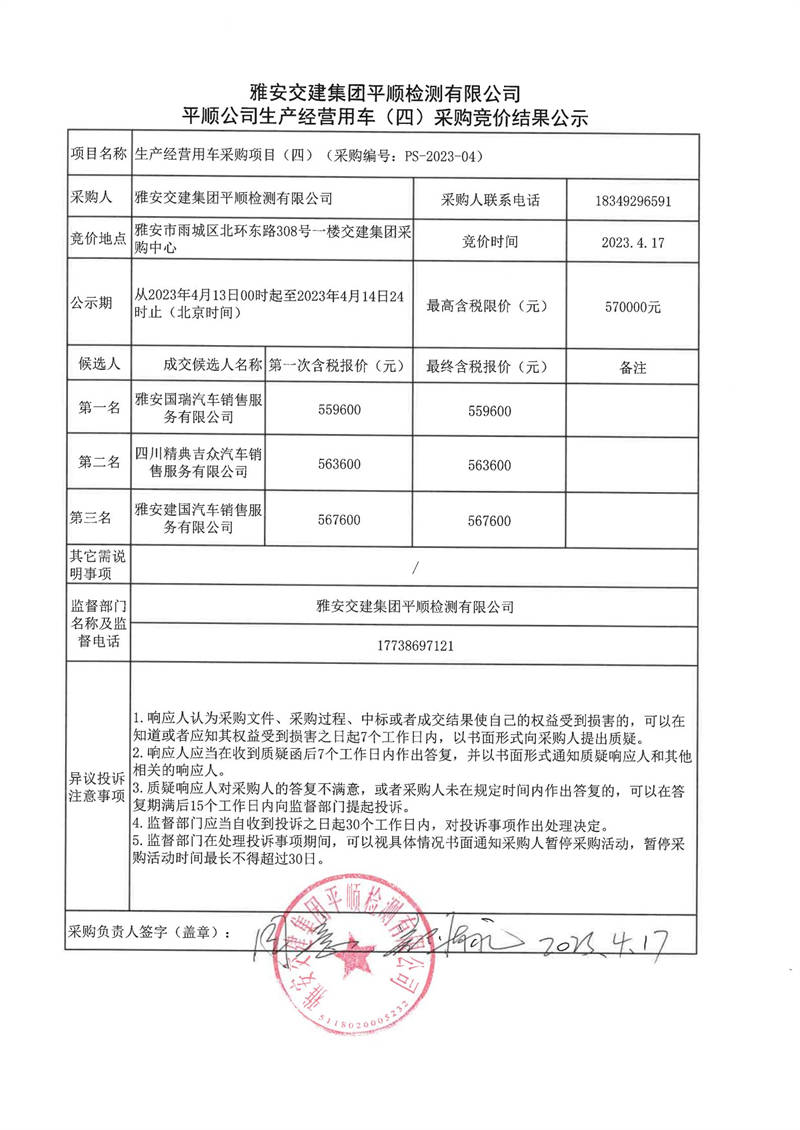 雅安交建集團(tuán)平順檢測(cè)有限公司平順公司生產(chǎn)經(jīng)營用車(四)采購競(jìng)價(jià)結(jié)果公示