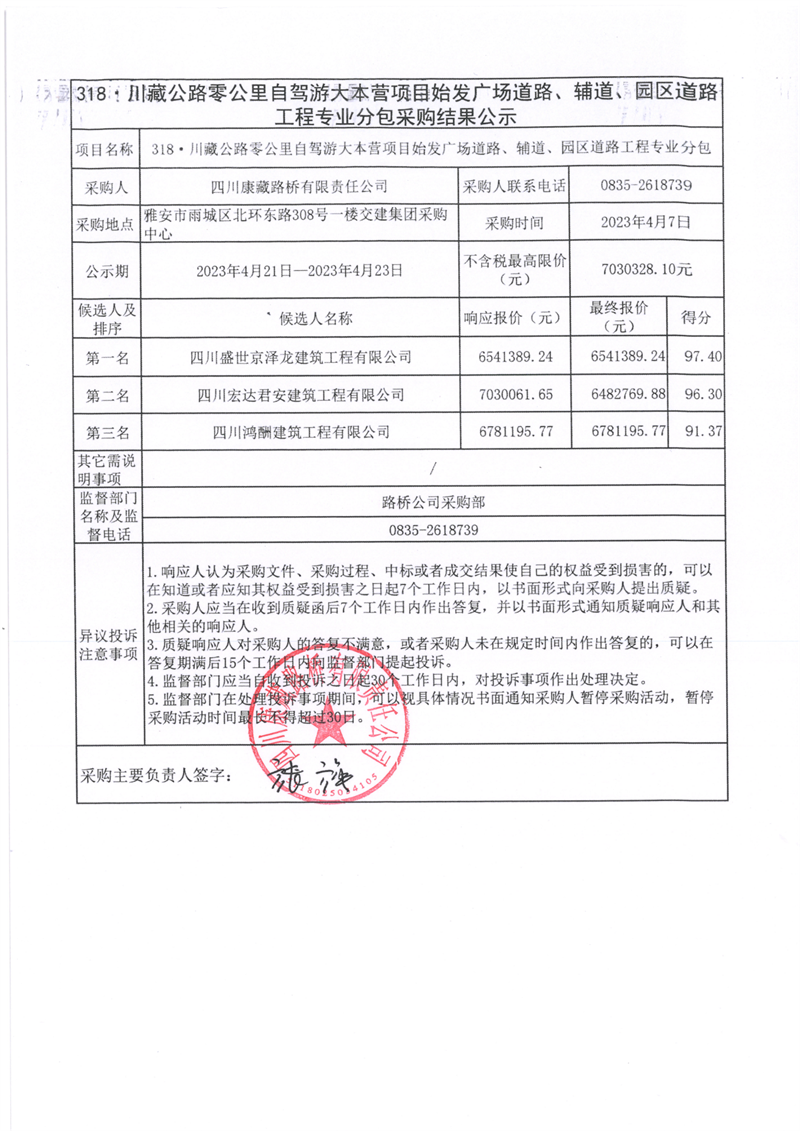 四川康藏路橋有限責任公司318·川藏公路零公里自駕游大本營項目始發(fā)廣場道路、輔道、園區(qū)道路工程專業(yè)分包采購結果公示