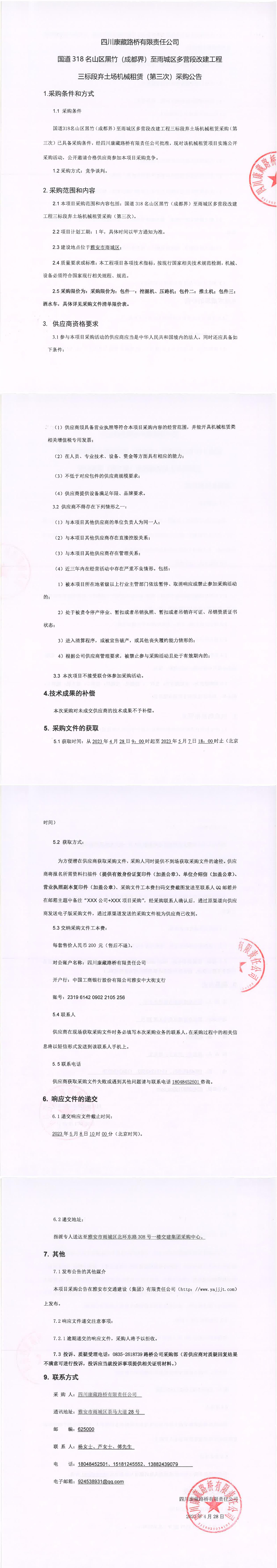 四川康藏路橋有限責(zé)任公司國道318名山區(qū)黑竹(成都界)至雨城區(qū)多營段改建工程三標段棄土場機械租賃(第三次)采購公告