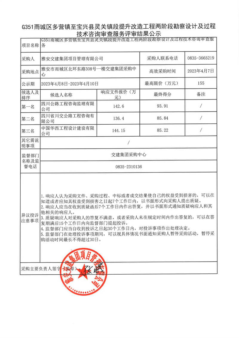 雅安交建集團項目管理有限公司G351雨城區(qū)多營鎮(zhèn)至寶興縣靈關(guān)鎮(zhèn)段提升改造工程兩階段勘察設(shè)計及過程技術(shù)咨詢審查服務評審結(jié)果公示