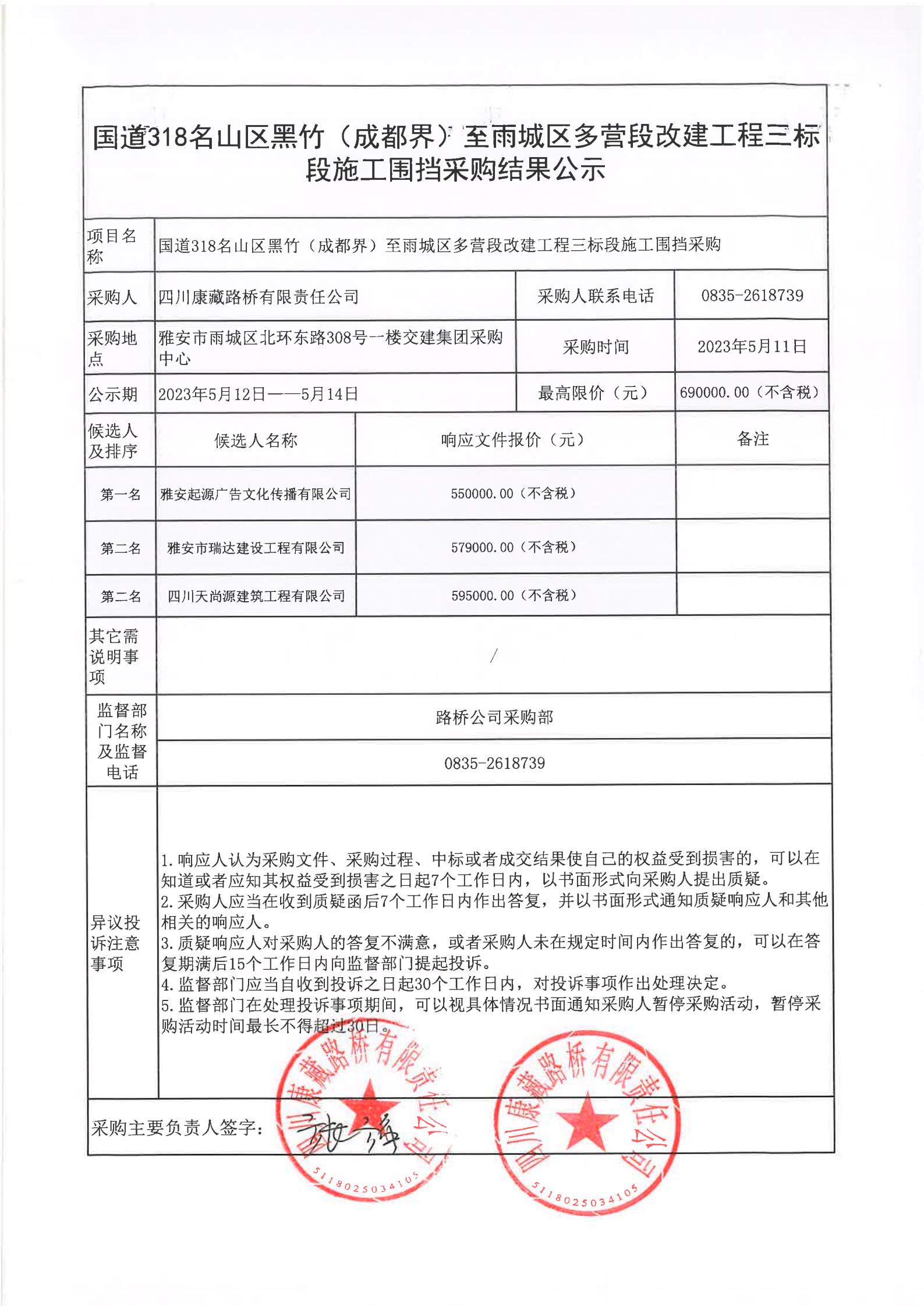 四川康藏路橋有限責(zé)任公司國道318名山區(qū)黑竹(成都界)至雨城區(qū)多營段改建工程三標段施工圍擋采購結(jié)果公示