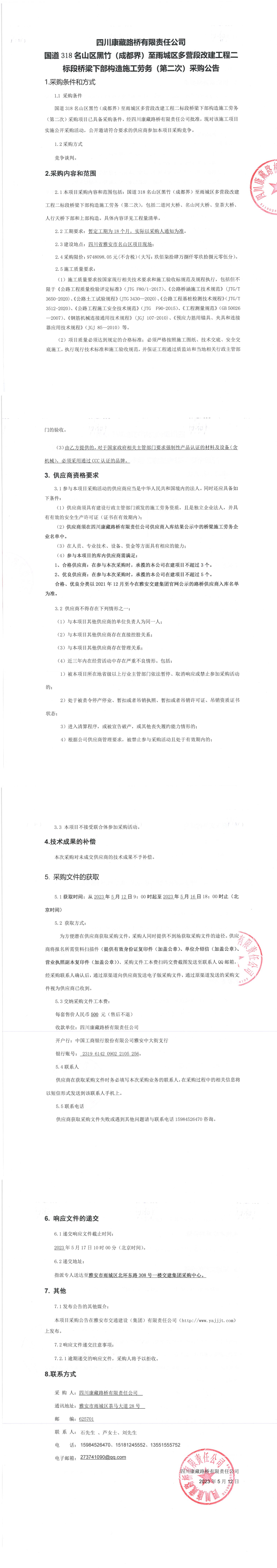 四川康藏路橋有限責(zé)任公司國道318名山區(qū)黑竹(成都界)至雨城區(qū)多營段改建工程二標(biāo)段橋梁下部構(gòu)造施工勞務(wù)(第二次)采購公告