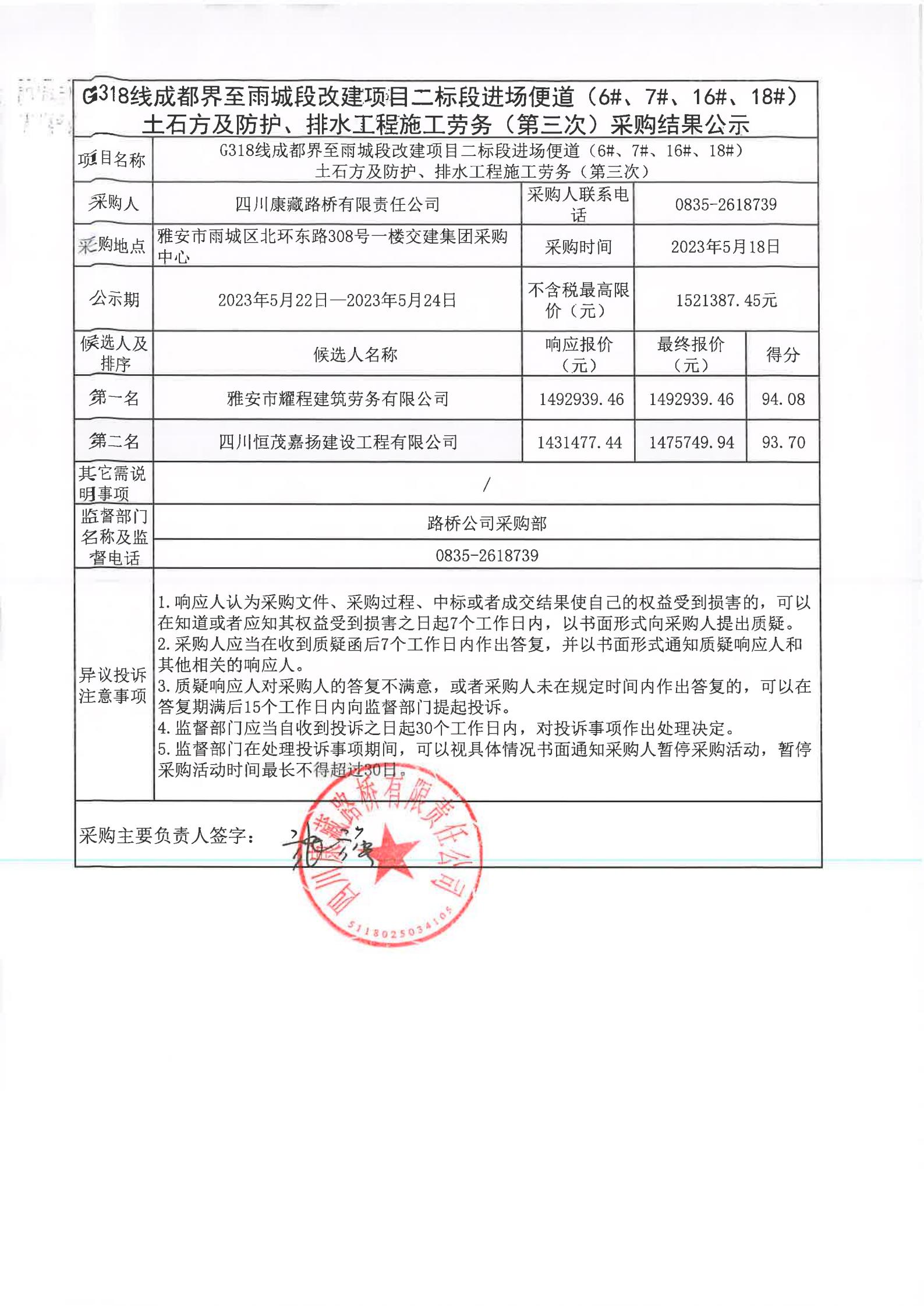 四川康藏路橋有限責(zé)任公司G318線成都至雨城段改建項目二標(biāo)段進(jìn)場便道(6#、7#、16#、18#)土石方及防護(hù)、排水工程施工勞務(wù)(第三次)采購結(jié)果公示