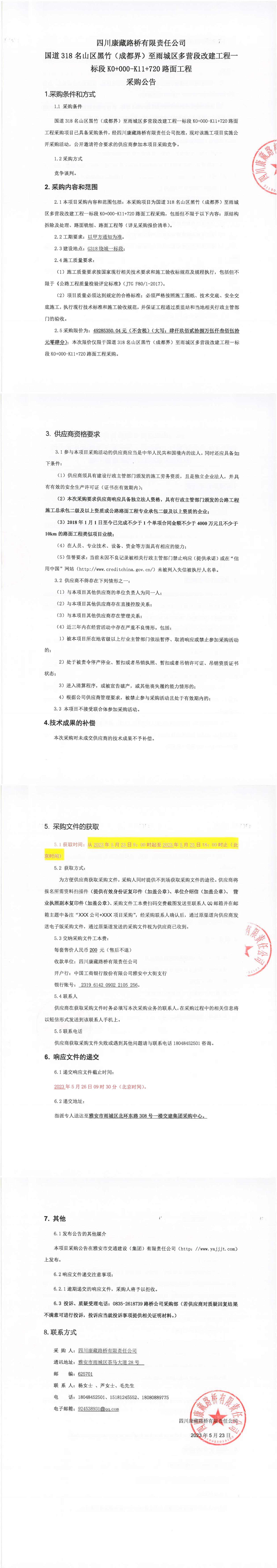 四川康藏路橋有限責任公司國道318名山區(qū)黑竹(成都界)至雨城區(qū)多營段改建工程一標段K0+000-K11+720路面工程采購公告