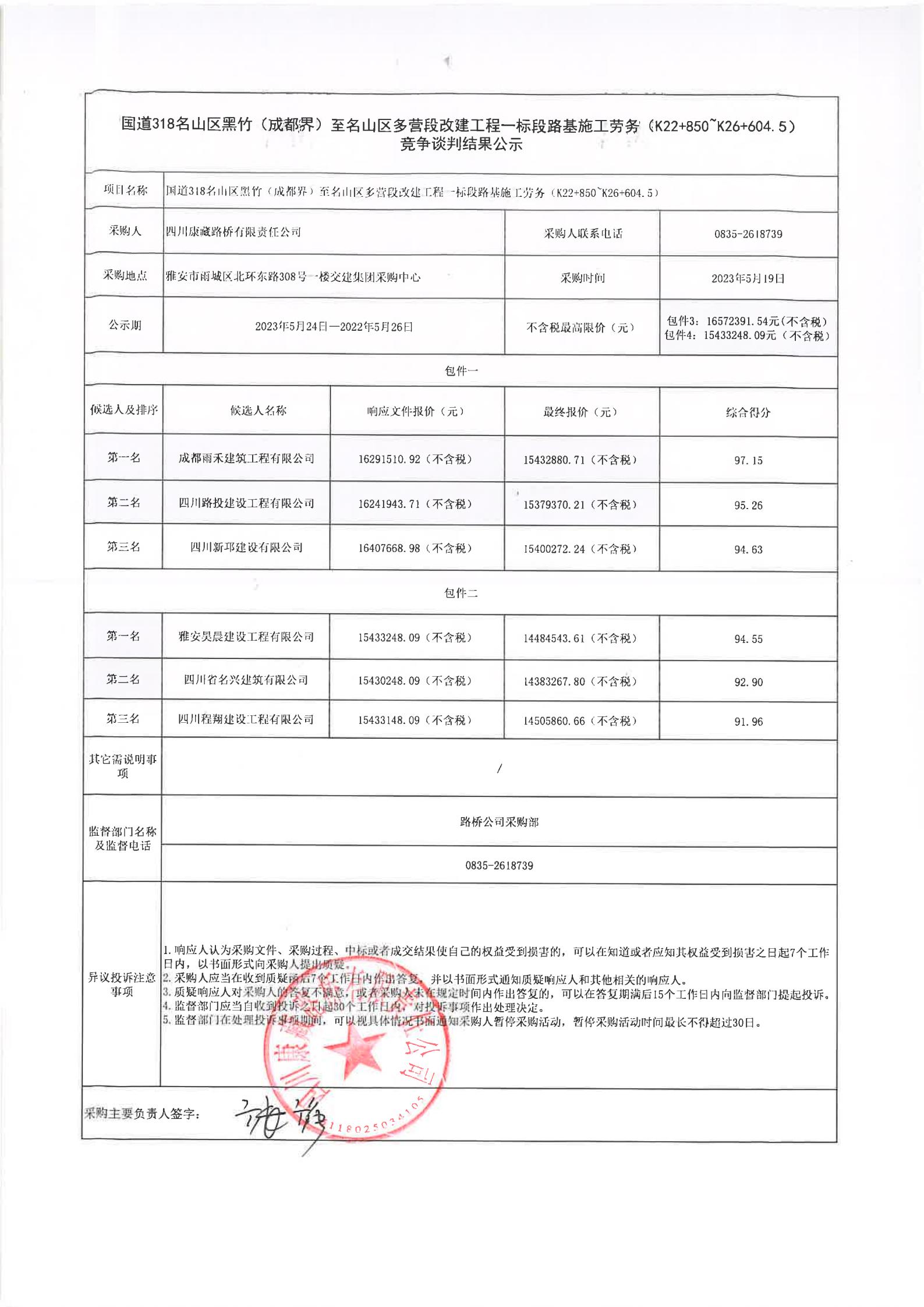 四川康藏路橋有限責(zé)任公司國道318名山區(qū)黑竹(成都界)至雨城區(qū)多營段改建工程一標(biāo)段路基施工勞務(wù)(K22+850~K26+604.5)競爭談判結(jié)果公示