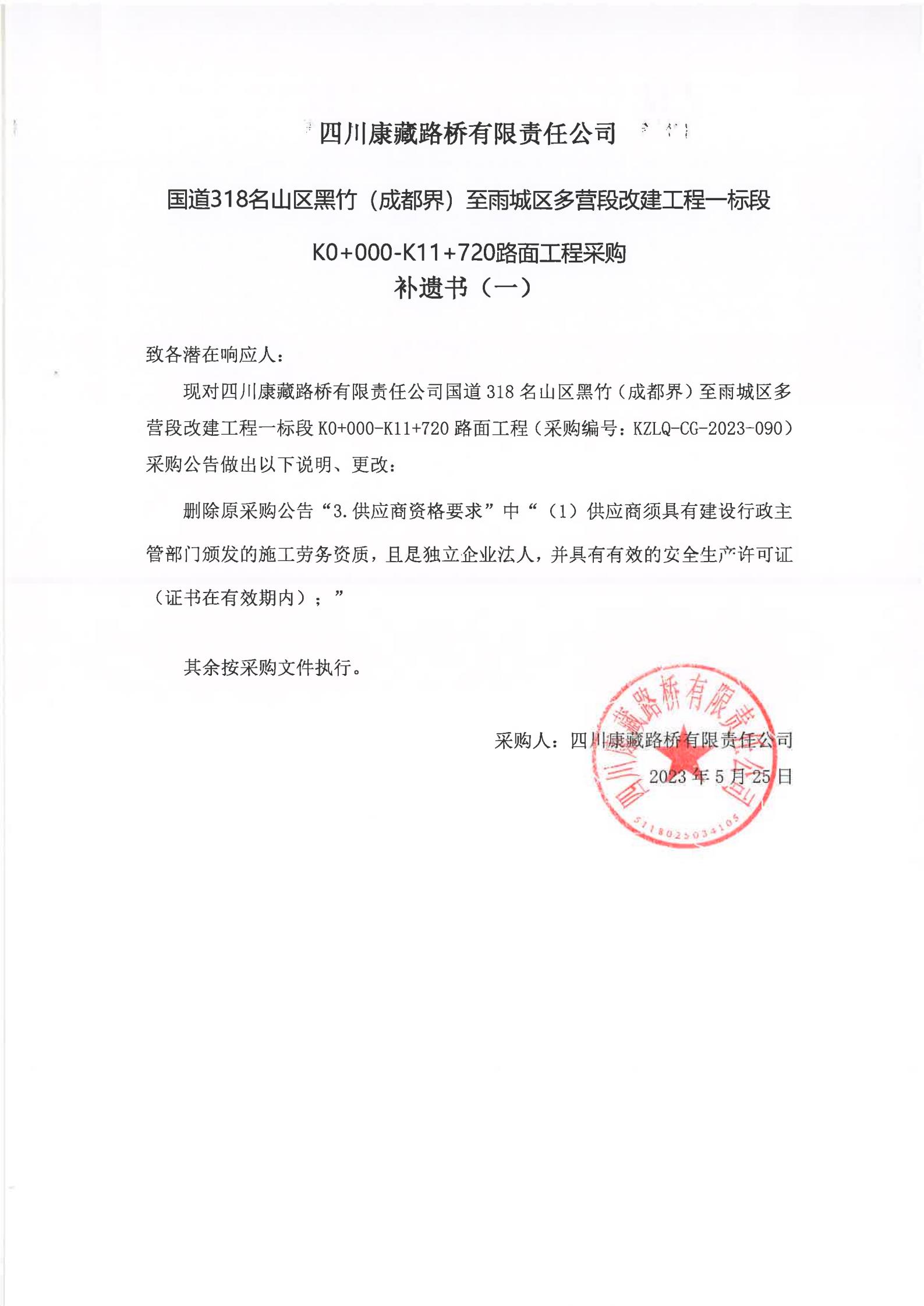 四川康藏路橋有限責(zé)任公司國道318名山區(qū)黑竹(成都界)至雨城區(qū)多營段改建工程一標段K0+000-K11+720路面工程采購補遺書(一)