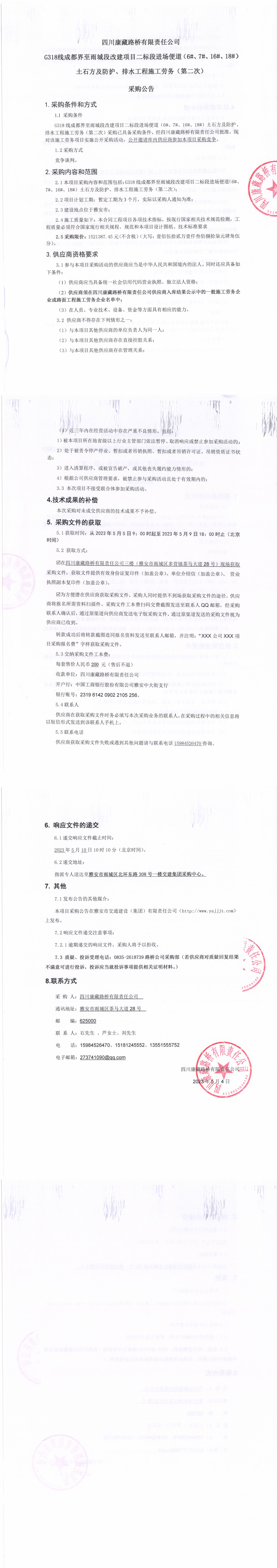 四川康藏路橋有限責任公司G318線成都至雨城段改建項目二標段進場便道(6#、7#、16#、18#)土石方及防護、排水工程施工勞務(wù)(第二次)采購公告