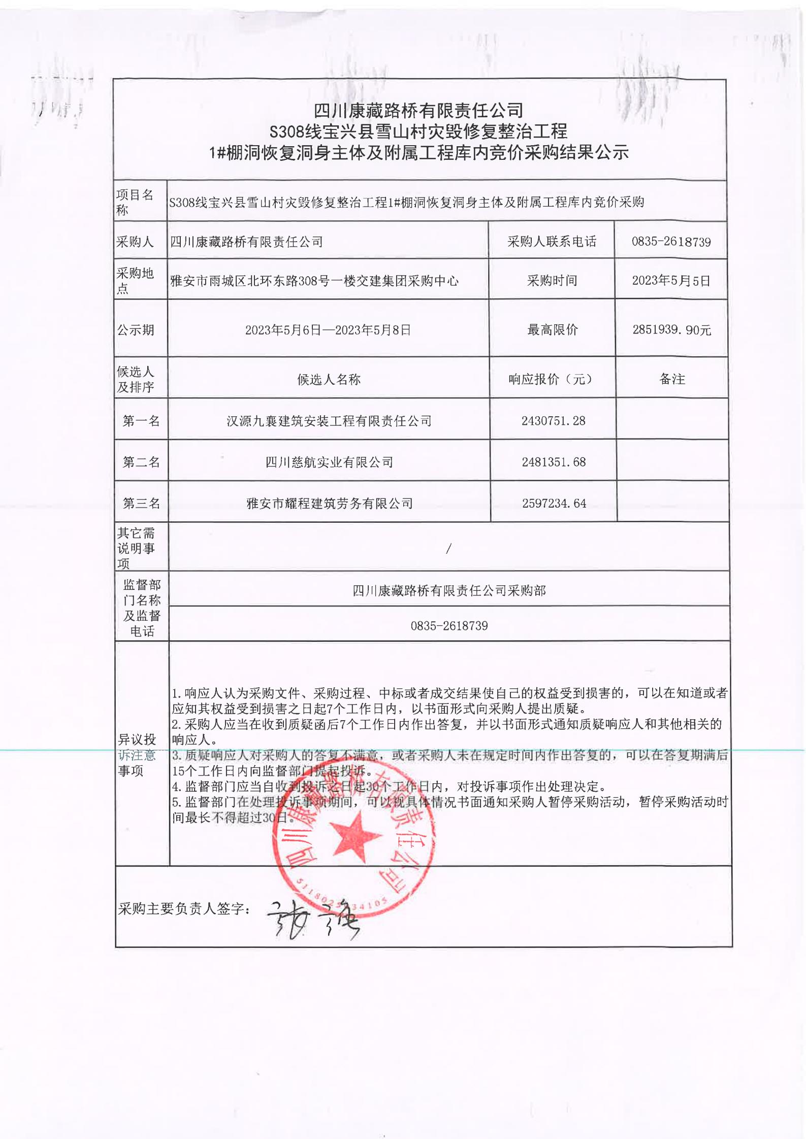 四川康藏路橋有限責(zé)任公司S308線(xiàn)寶興縣雪山村災(zāi)毀修復(fù)整治工程1#棚洞恢復(fù)洞身主體及附屬工程庫(kù)內(nèi)競(jìng)價(jià)采購(gòu)結(jié)果公示