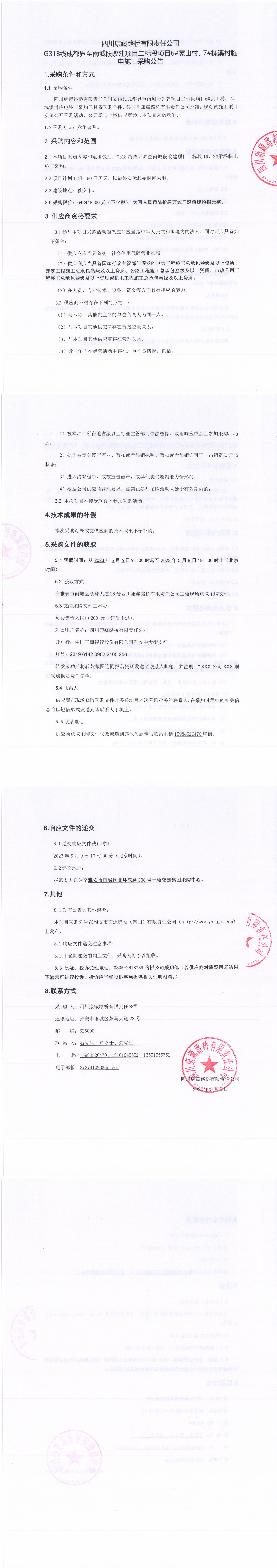 四川康藏路橋有限責(zé)任公司G318線成都至雨城段改建項目二標段項目6#蒙山村、7#槐溪村臨時電施工采購公告