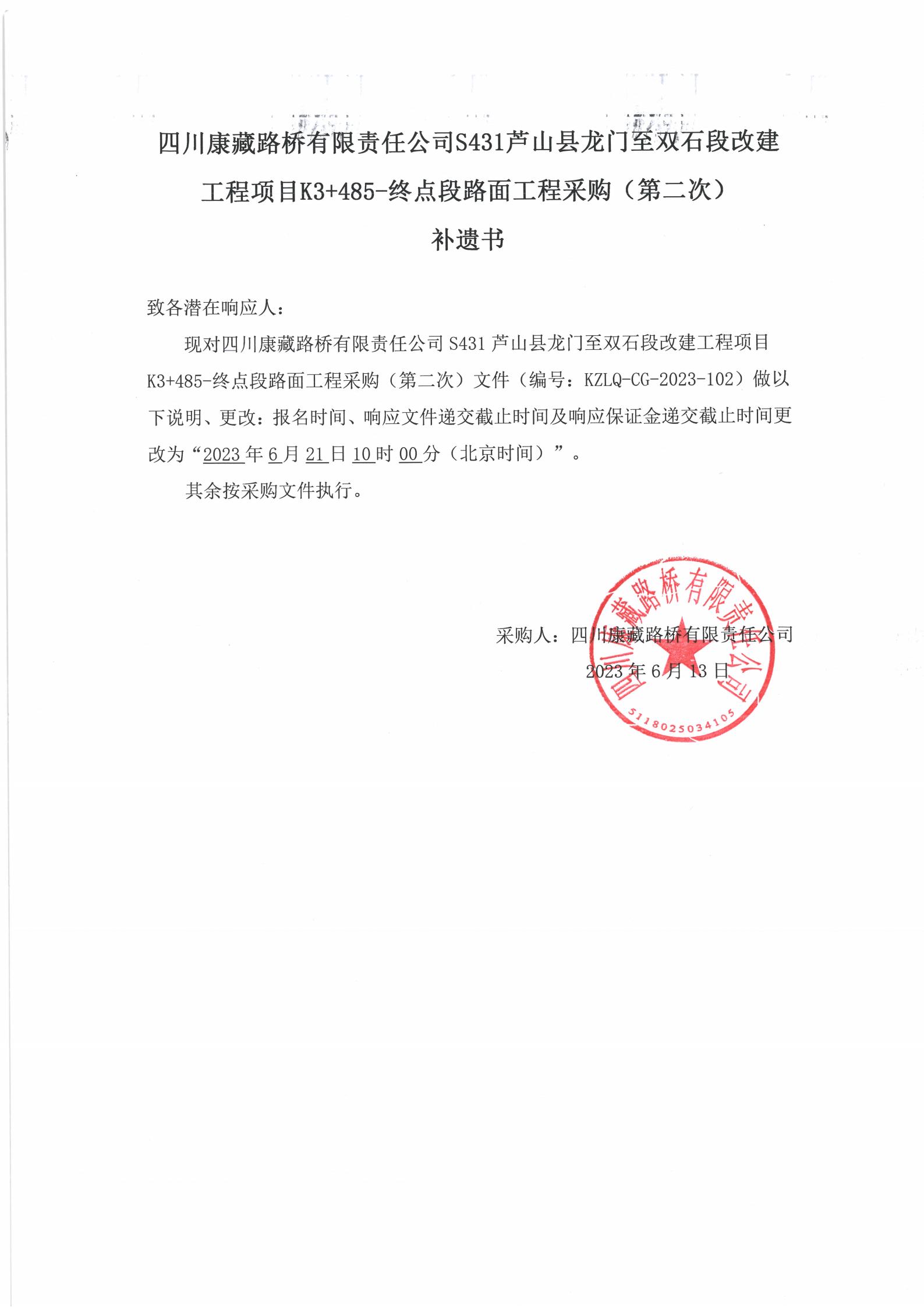 四川康藏路橋有限責(zé)任公司S431蘆山縣龍門至雙石段改建工程項(xiàng)目K3+485-終點(diǎn)段路面工程采購(gòu)(第二次)補(bǔ)遺書(shū)