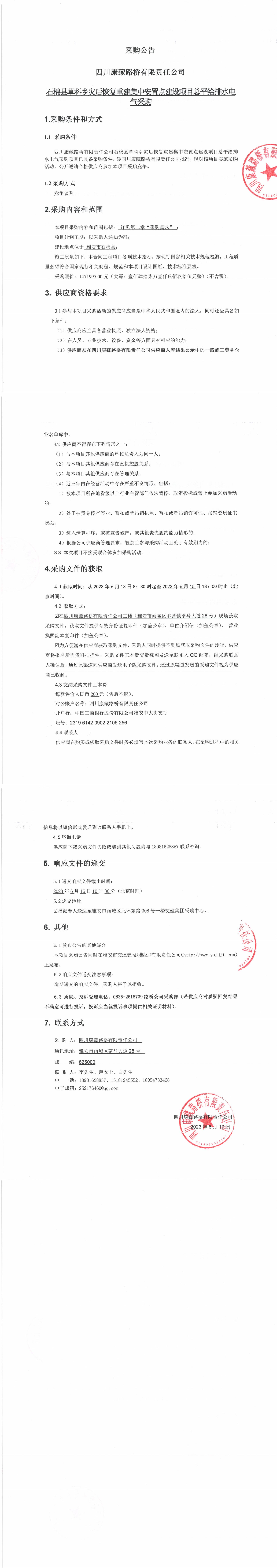 四川康藏路橋有限責(zé)任公司石棉縣草科鄉(xiāng)災(zāi)后恢復(fù)重建集中安置點(diǎn)建設(shè)項(xiàng)目總平給排水電器采購公告