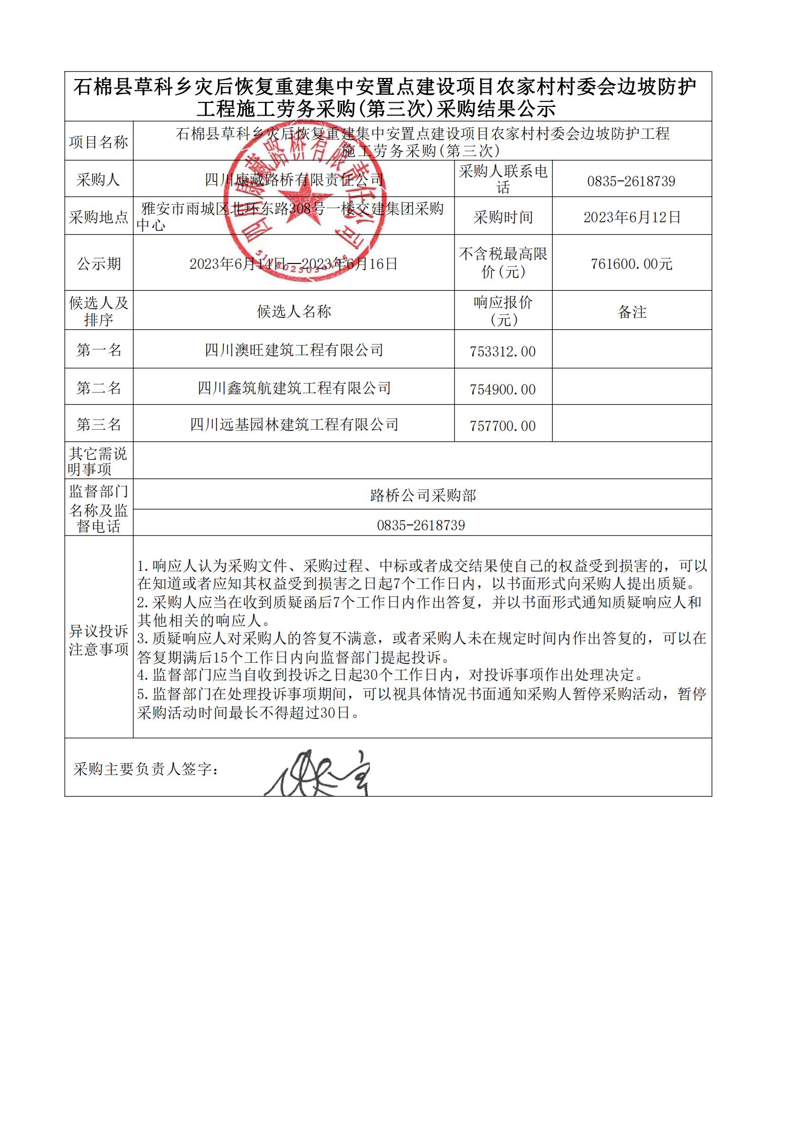 四川康藏路橋有限責任公司石棉縣草科鄉(xiāng)災后恢復重建集中安置點建設項目農(nóng)家村村委會邊坡防護工程施工勞務采購(第三次)結(jié)果公示
