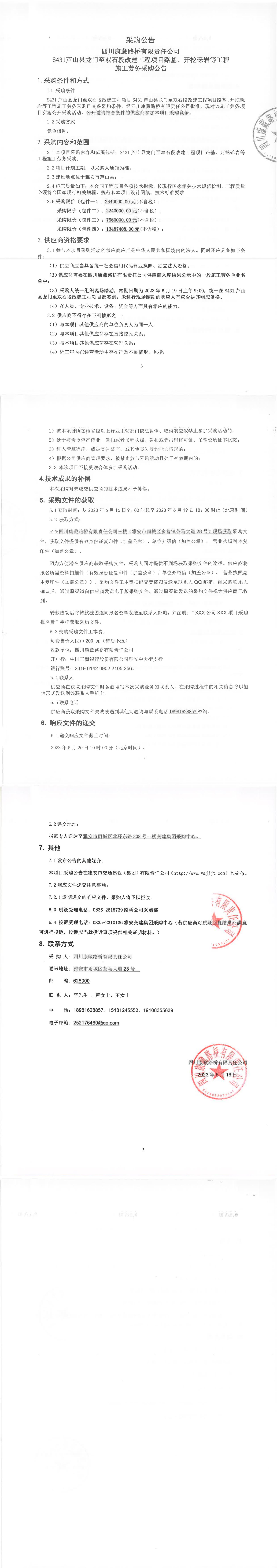 四川康藏路橋有限責(zé)任公司S431蘆山縣龍門至雙石段改建工程項(xiàng)目路基、開挖礫巖等工程施工勞務(wù)采購(gòu)公告