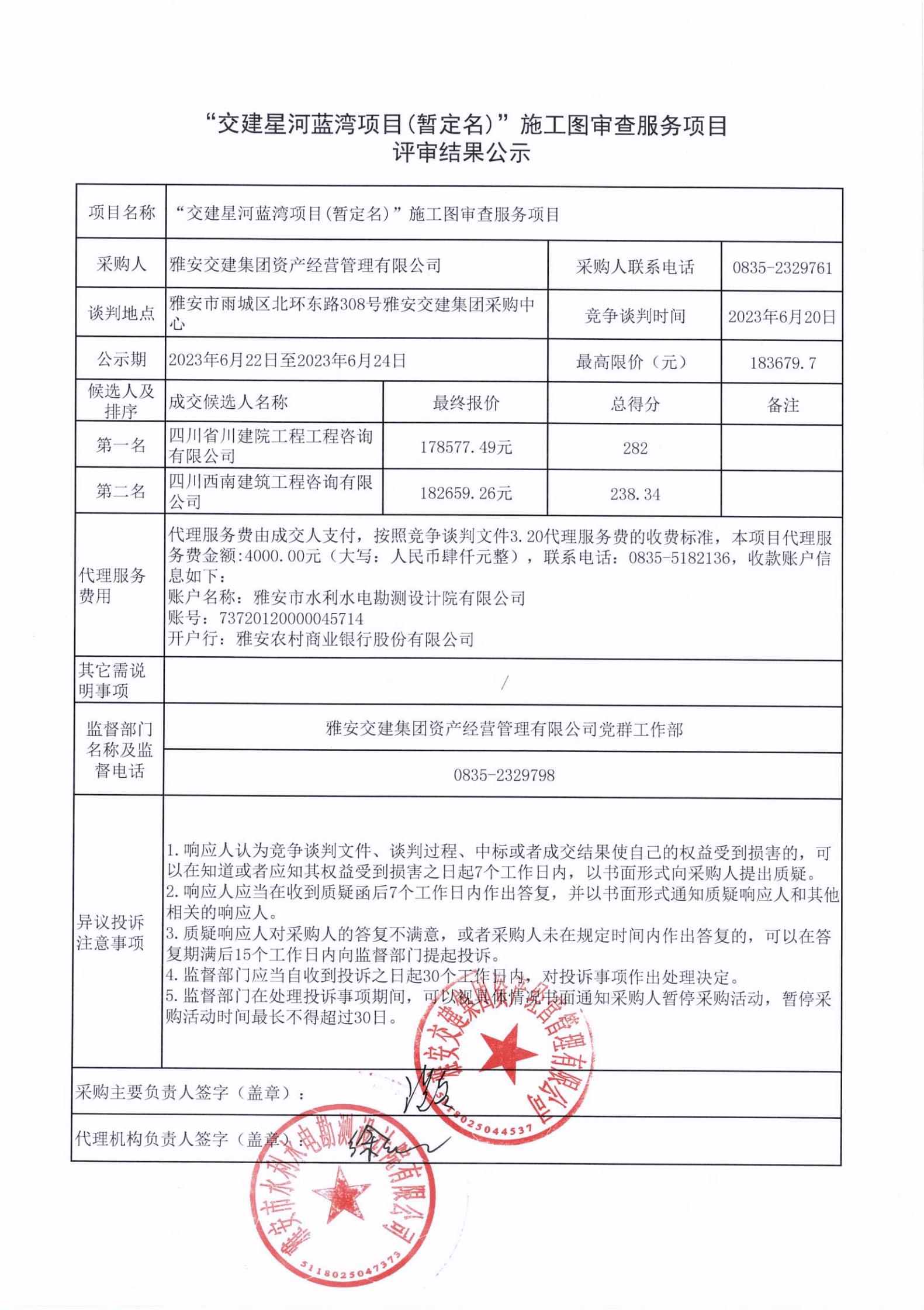 雅安交建集團資產(chǎn)經(jīng)營管理有限公司“交建星河藍灣項目(暫定名)”施工圖審查服務(wù)項目評審結(jié)果公示