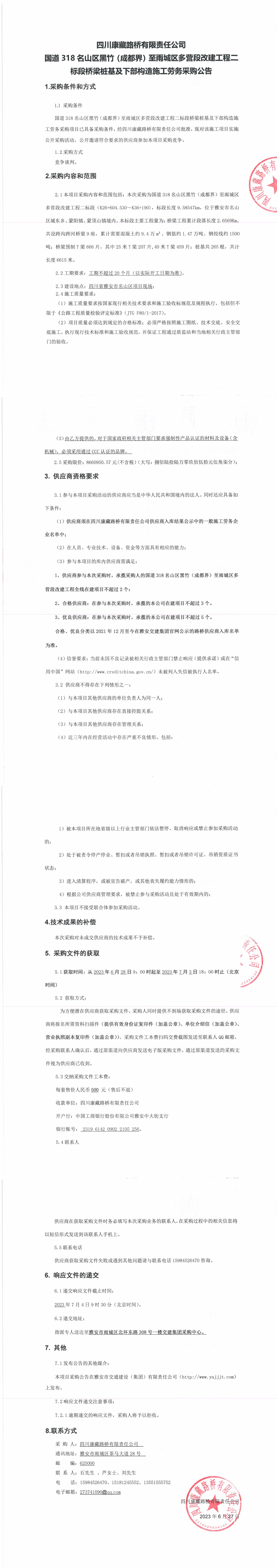 四川康藏路橋有限責(zé)任公司國道318名山區(qū)黑竹(成都界)至雨城區(qū)多營段改建工程二標(biāo)段橋梁樁基及下部構(gòu)造施工勞務(wù)采購公告