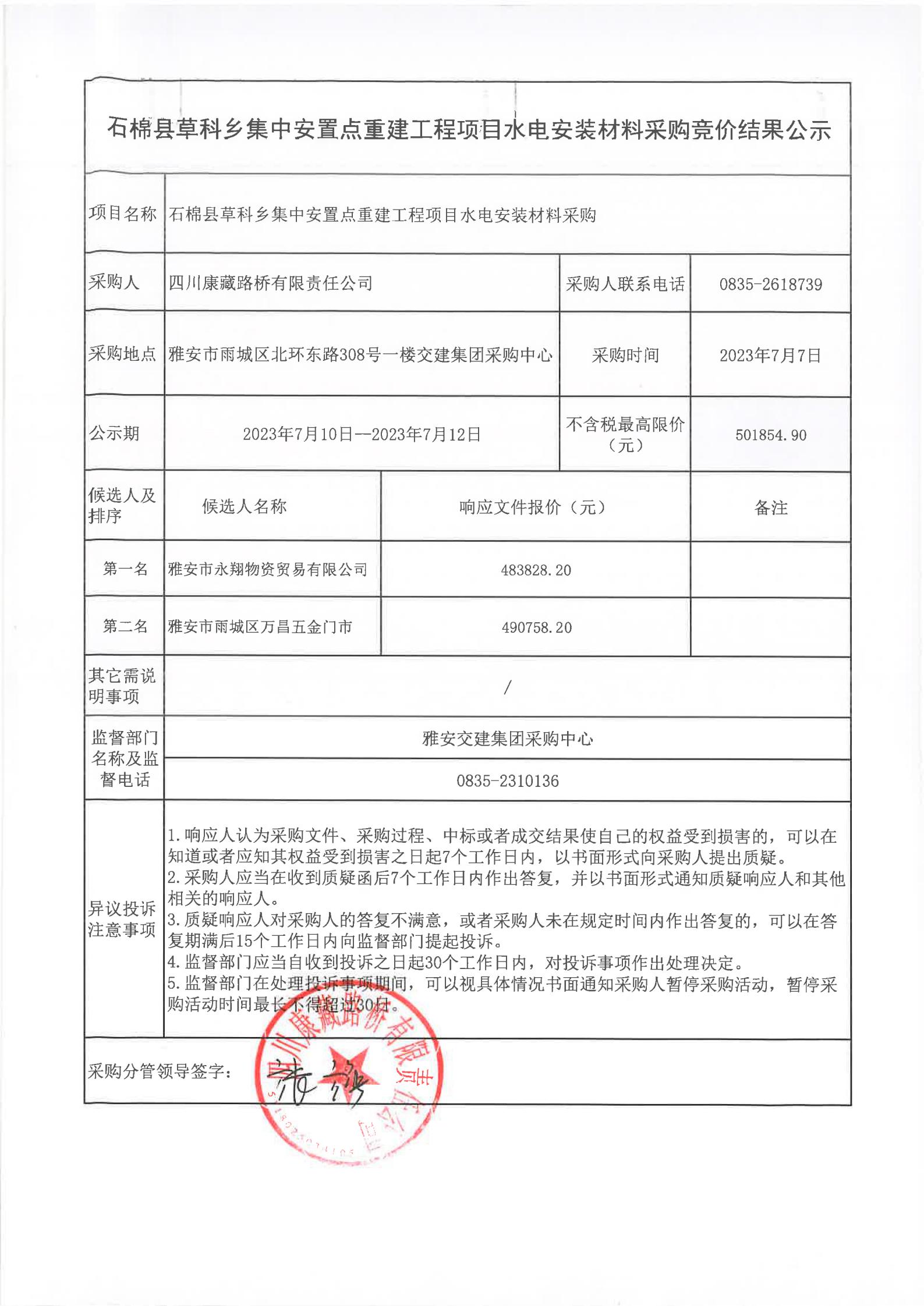 四川康藏路橋有限責任公司石棉草科鄉(xiāng)集中安置點重建工程項目水電安裝材料采購競價結(jié)果公示