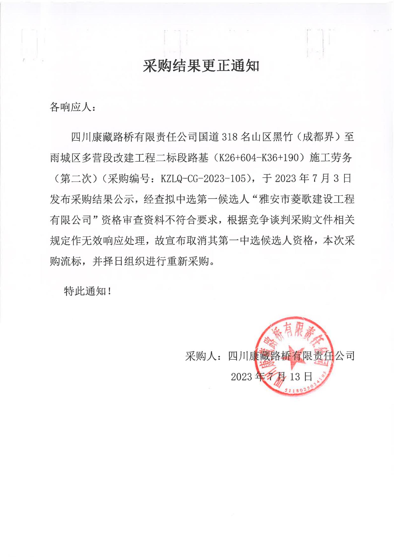四川康藏路橋有限責任公司國道318名山區(qū)黑竹(成都界)至雨城區(qū)多營段改建工程二標段路基(K26+604-K36+190)施工勞務(第二次)采購結(jié)果更正通知