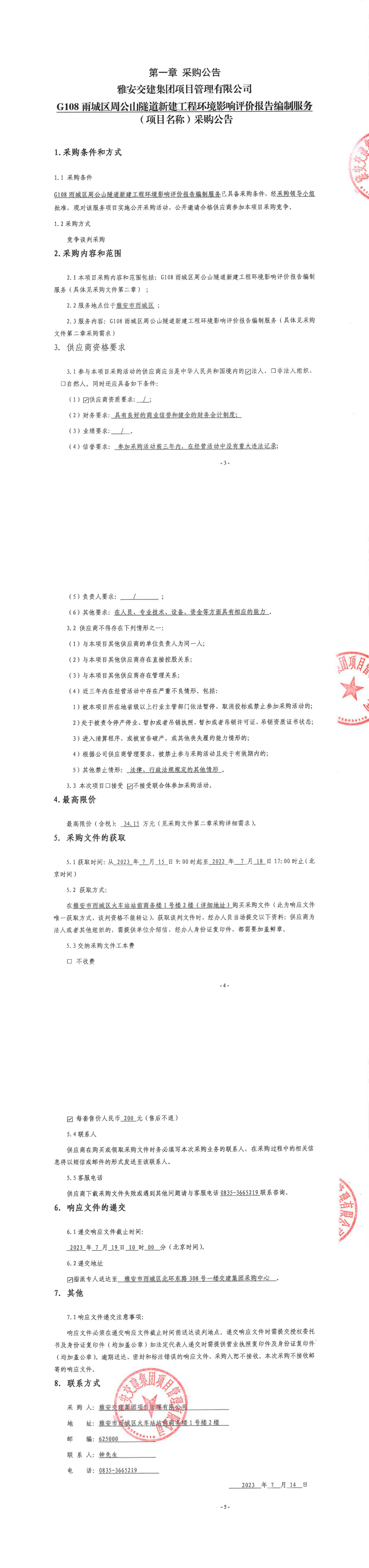 雅安交建集團(tuán)項(xiàng)目管理有限公司G108雨城區(qū)周公山隧道新建工程環(huán)境影響評(píng)價(jià)報(bào)告編制服務(wù)(項(xiàng)目名稱)采購公告
