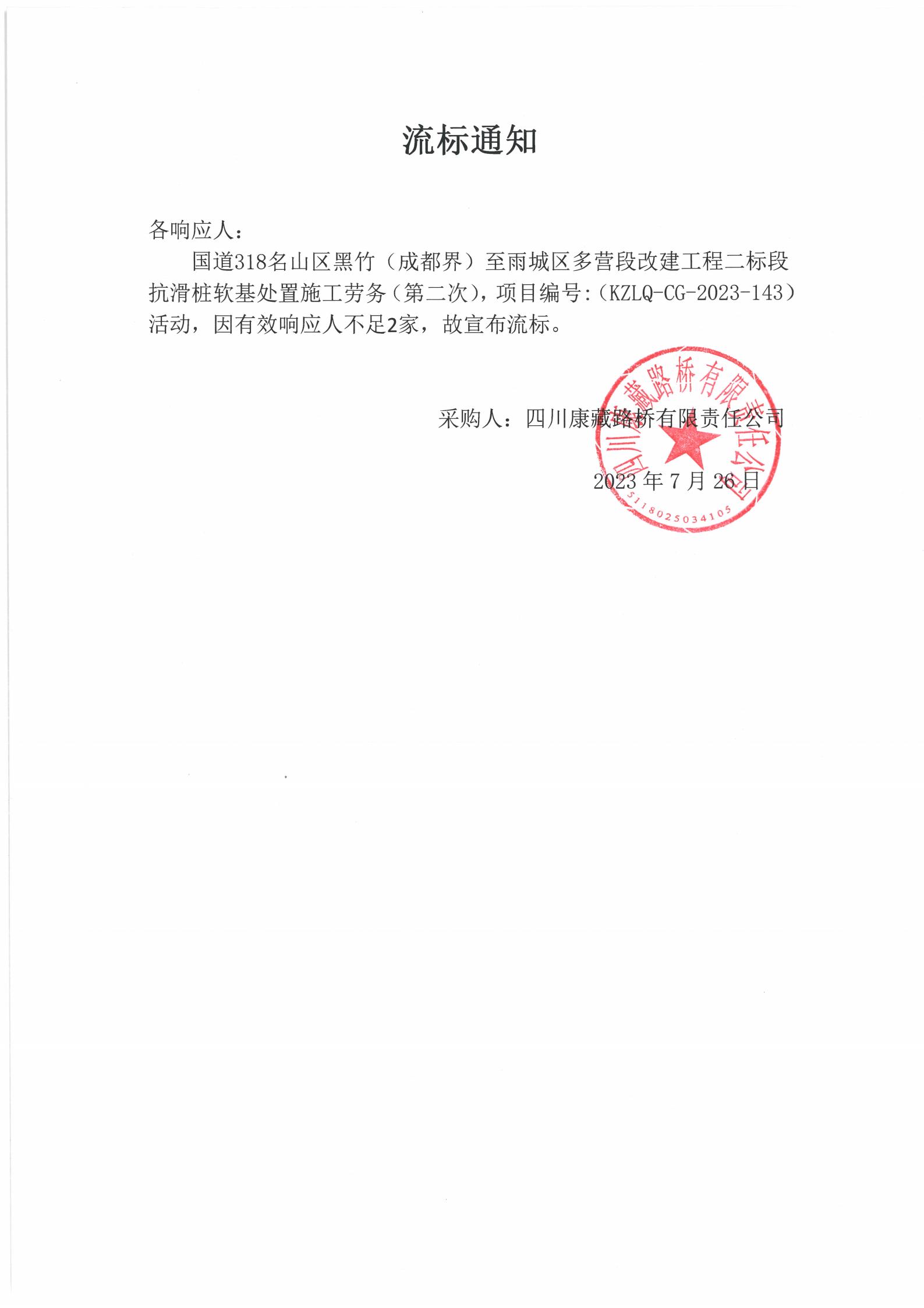 四川康藏路橋有限責(zé)任公司國道318名山區(qū)黑竹(成都界)至雨城區(qū)多營段改建工程二標(biāo)段抗滑樁軟基處置施工勞務(wù)(第二次)流標(biāo)通知