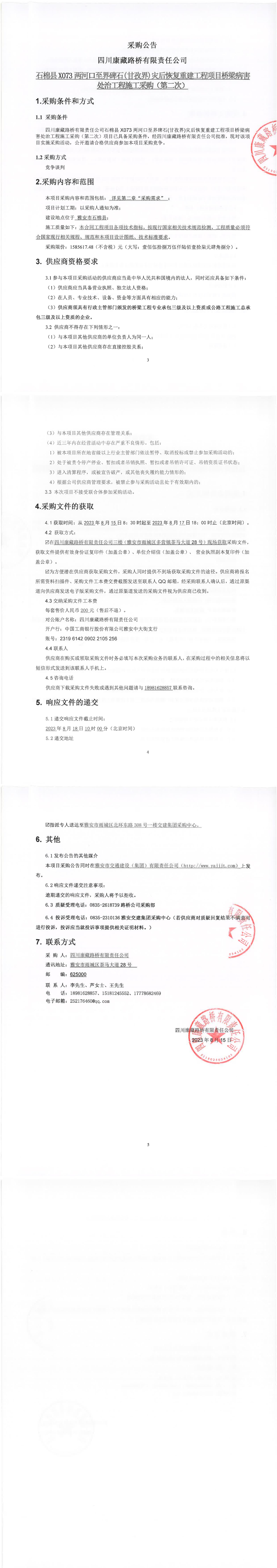 四川康藏路橋有限責任公司石棉縣X703兩河口至界碑石(甘孜界)災(zāi)后恢復(fù)重建工程項目橋梁病害處治工程施工采購(第二次)