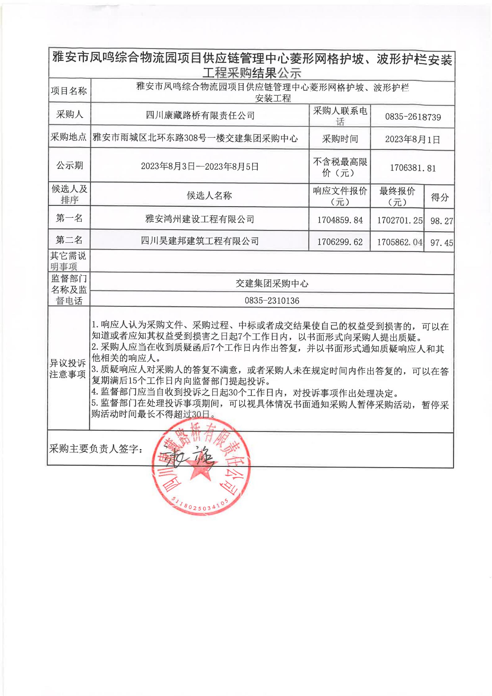 四川康藏路橋有限責任公司雅安市鳳鳴綜合物流園項目供應鏈管理中心菱形網(wǎng)格護坡、波形護欄安裝工程采購結(jié)果公示