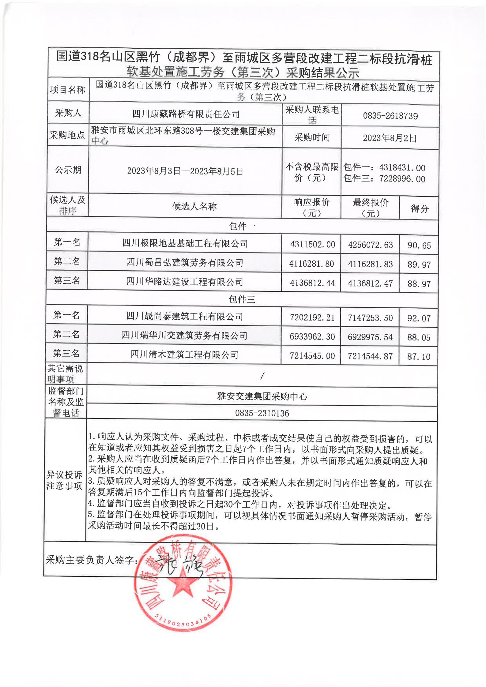 四川康藏路橋有限責任公司國道318名山區(qū)黑竹(成都界)至雨城區(qū)多營段改建工程二標段抗滑樁軟基處置施工勞務(第三次)采購結(jié)果公示