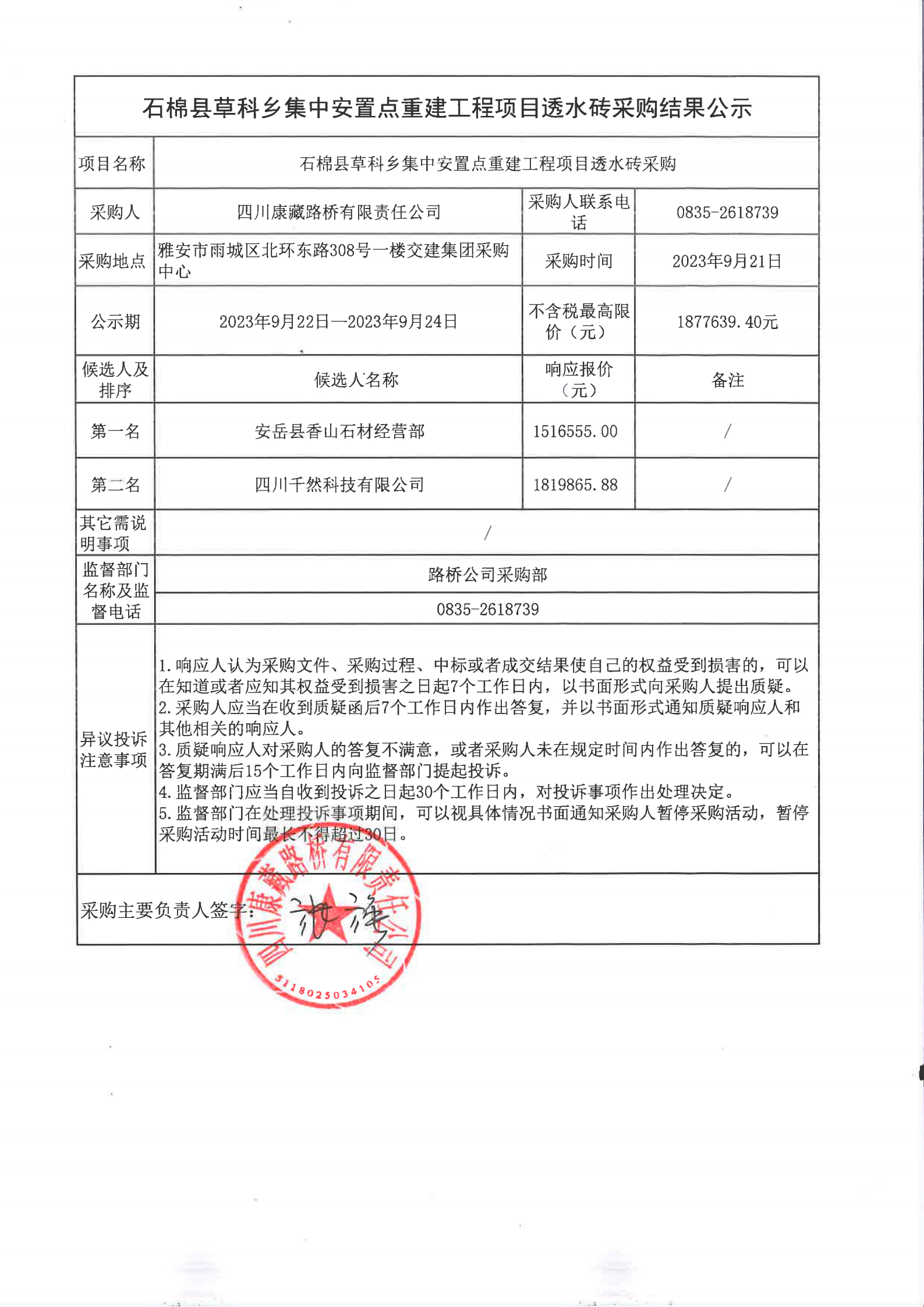 四川康藏路橋有限責(zé)任公司石棉縣草科鄉(xiāng)集中安置點(diǎn)重建工程項(xiàng)目透水磚采購(gòu)結(jié)果公示