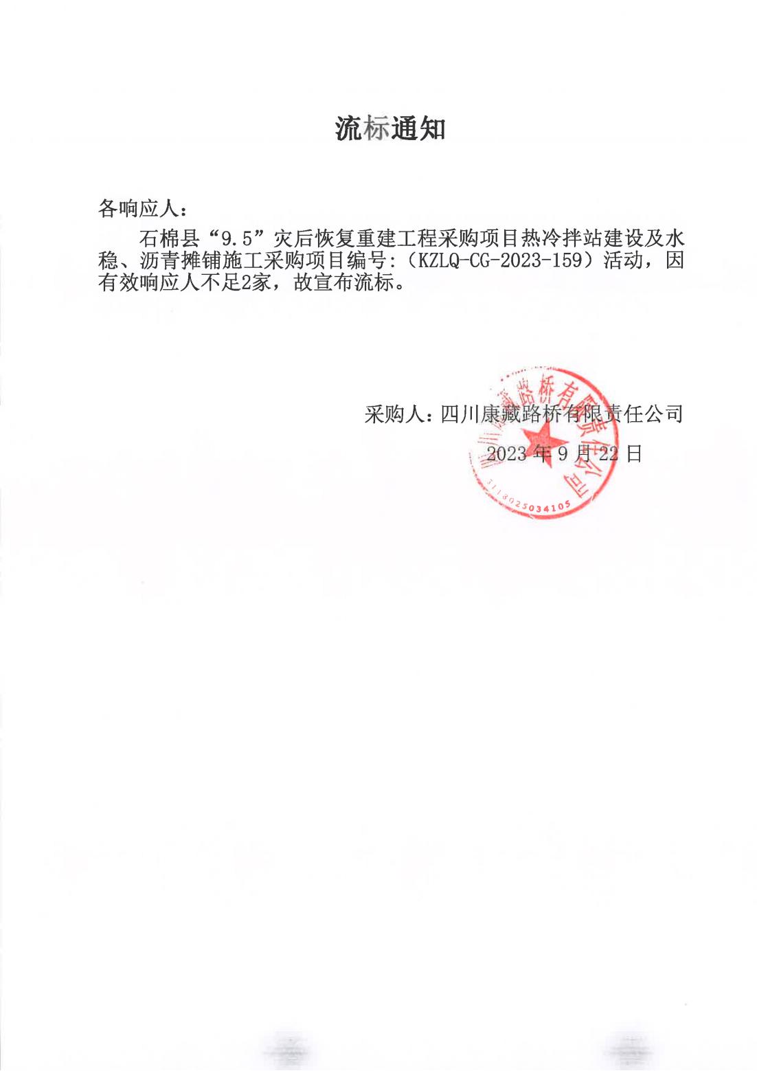 四川康藏路橋有限責(zé)任公司石棉縣“9·5”災(zāi)后恢復(fù)重建工程采購項(xiàng)目熱冷拌站建設(shè)及水穩(wěn)、瀝青攤鋪施工采購流標(biāo)通知