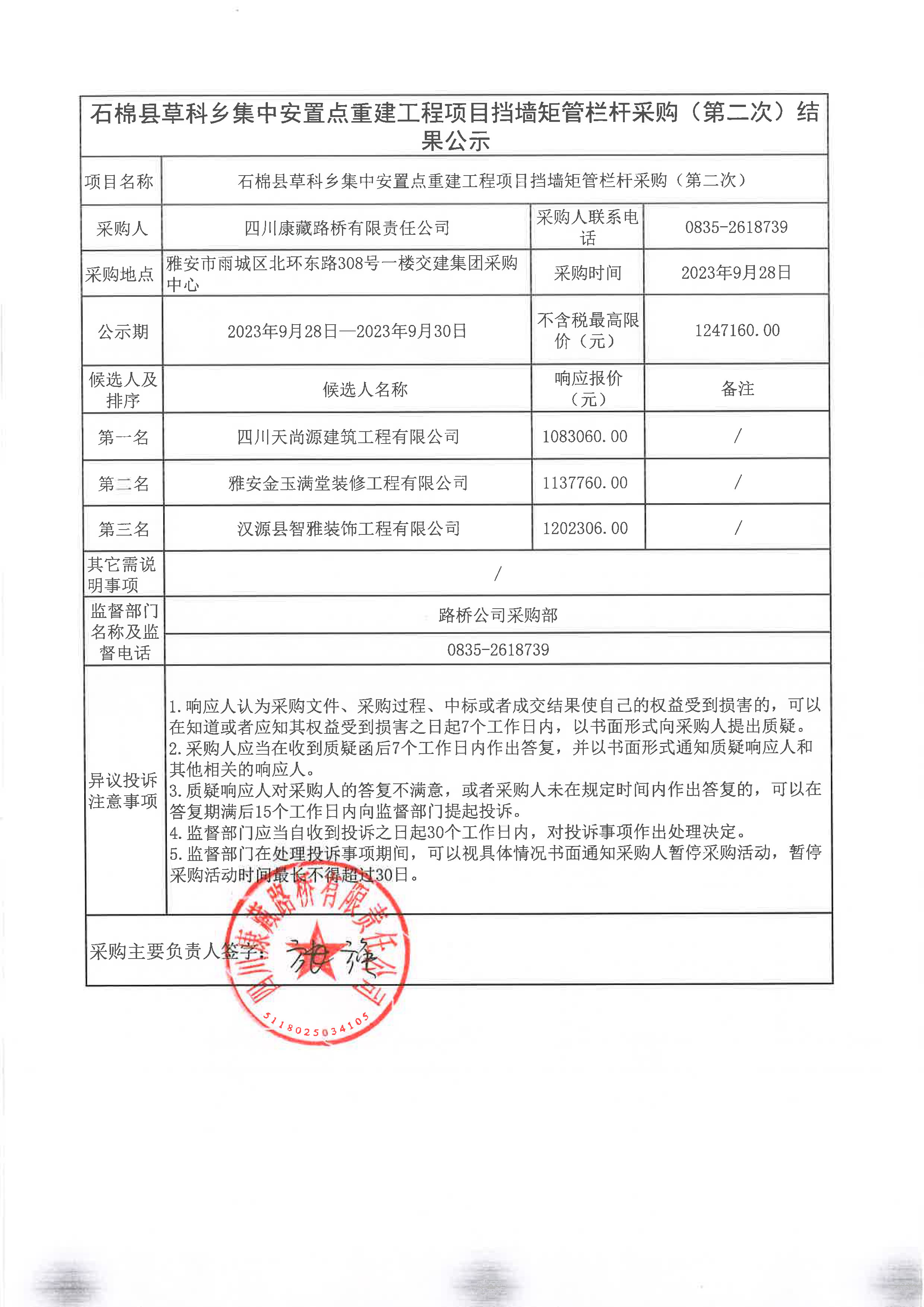 四川康藏路橋有限責(zé)任公司石棉縣草科鄉(xiāng)集中安置點(diǎn)重建工程項(xiàng)目擋墻矩管欄桿采購(gòu)(第二次)結(jié)果公示