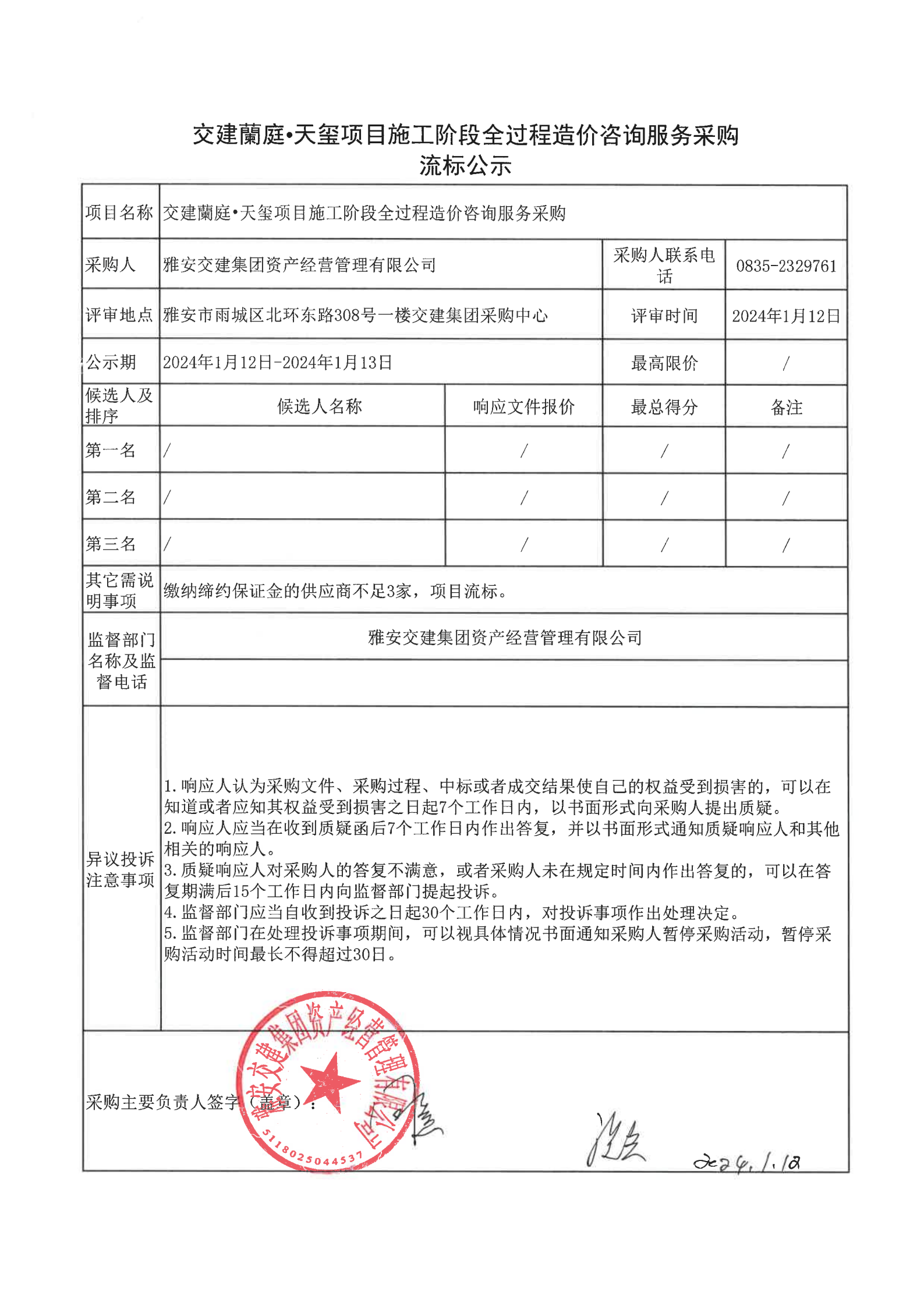 雅安交建集團(tuán)資產(chǎn)經(jīng)營管理有限公司交建蘭庭·天璽項(xiàng)目施工階段全過程造價(jià)咨詢服務(wù)采購流標(biāo)公示