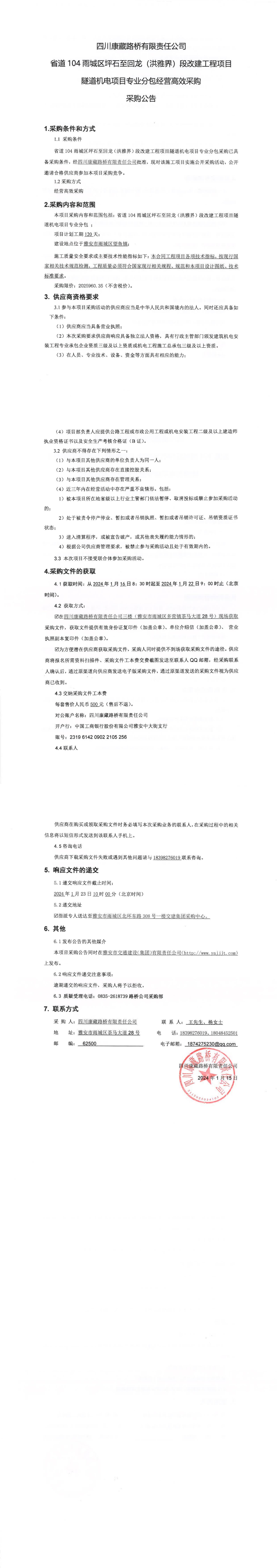 四川康藏路橋有限責(zé)任公司省道104雨城區(qū)坪石至回龍(洪雅界)段改建工程項(xiàng)目隧道機(jī)電項(xiàng)目專業(yè)分包經(jīng)營(yíng)高效采購公告