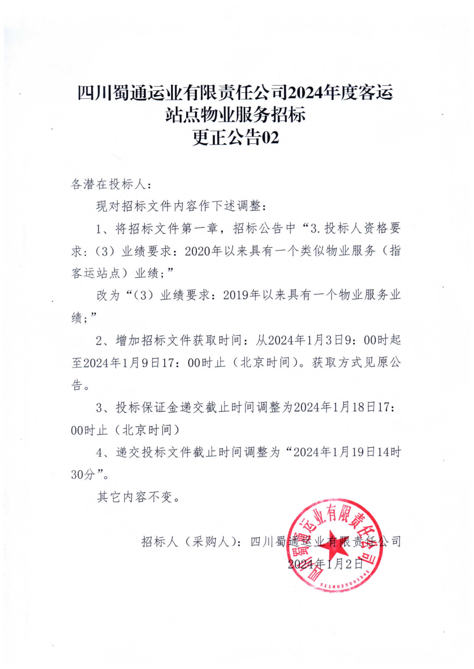 四川蜀通運業(yè)有限責(zé)任公司2024年度客運站點物業(yè)服務(wù)招標更正公告02